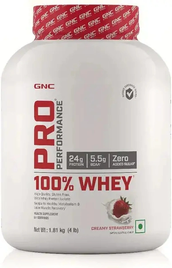 GNC Pro Performance 100% Whey Protein Powder | Boosts Strength & Endurance | Builds Lean Muscles | Fastens Muscle Recovery | Formulated In USA | 24g Protein | 5.5g BCAA | Creamy Strawberry | 4 lbs