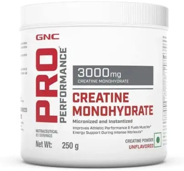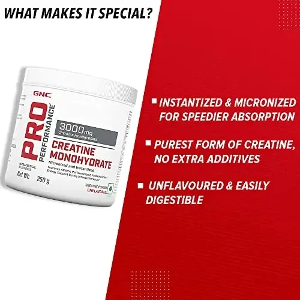 GNC Pro Performance Creatine Monohydrate | Boosts Athletic Performance | Micronized & Instantized | Fuels Muscles |Energy Support for Heavy Workout | Formulated In USA | Unflavoured powder| 250 gm