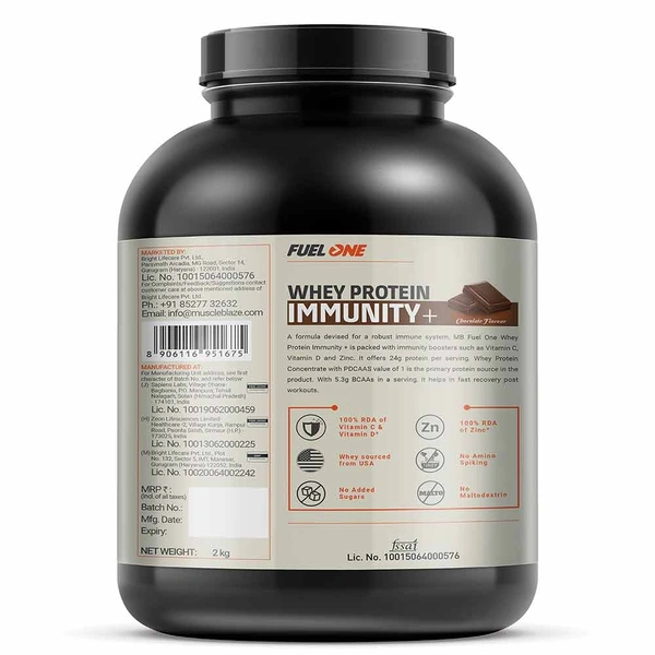 100% RDA of Vitamin C, D, and Zinc: MB Fuel One Whey Protein Immunity+ has 100% RDA of all these immunity-developing micronutrients to ensure that you get 100% of the daily requirement of these super-agents and improve your health. Vitamin C boosts the production of white blood cells to protect you against infections. Vitamin D helps modulate the immune system response and Zinc is essential for optimum immune function and helps keep inflammation under control.