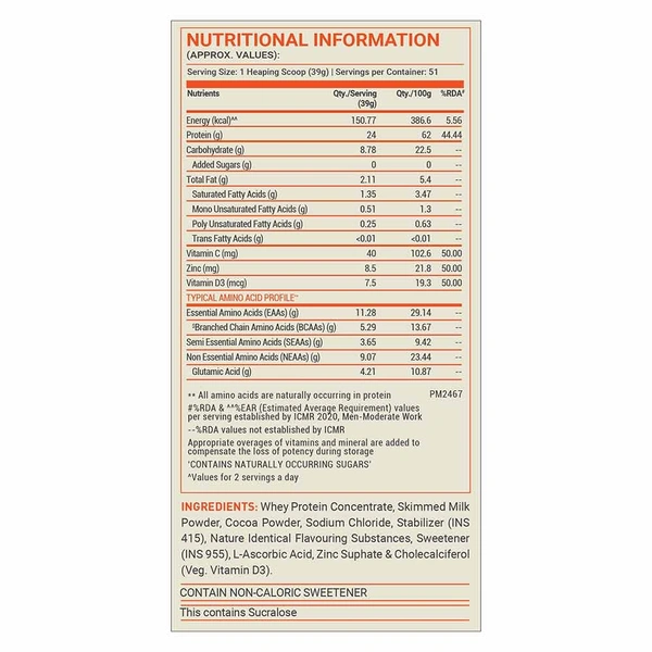 Milk Solids (Whey Protein Concentrate & Whey Powder), Cocoa Powder, Sodium Chloride, Stabilizer (INS 415), Sweetener (INS 955), L-Ascorbic Acid, Zinc Sulphate & Cholecalciferol (Veg. D3).
